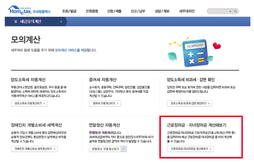 근로장려금 모의 계산하기 국세청 홈텍스에 홈페이지(www.hometax.go.kr) 모의계산 메뉴에서 근로장려금 자녀장려금 미리계산 메뉴를 통해 자격요건, 재산등 개인정보를 입력하고 모의계산 해볼 수 있습니다. 아래의 순서대로 차근차근 따라하시면 쉽게 확인이 가능합니다 🙂 홈택스 바로가기 모바일앱 다운로드 국세청 홈택스 홈페이지 접속홈페이지 상단의 [모의계산] 클릭[근로장려금·자녀장려금 계산해보기] 를 클릭체크사항 클릭 및 입력하고 확인